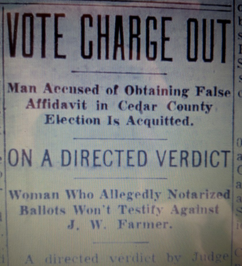 Officials tried, with the Cedar County grand jury eventually lodging five charges accusing Mr. Farmer of “feloniously affixing his notarial seal to a false affidavit of an absentee ballot.” Eight counts of “obtaining false affidavits” were filed by the grand jury in Jackson County, where some of the alleged absentee voters had supposedly marked their ballots.