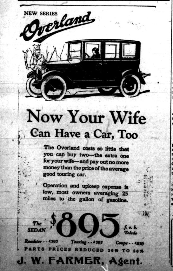 His early customers included my grandfather, John W. Beydler, described by the Optic as “a prosperous farmer three miles west of town.” He bought a new Overland in September, 1919.