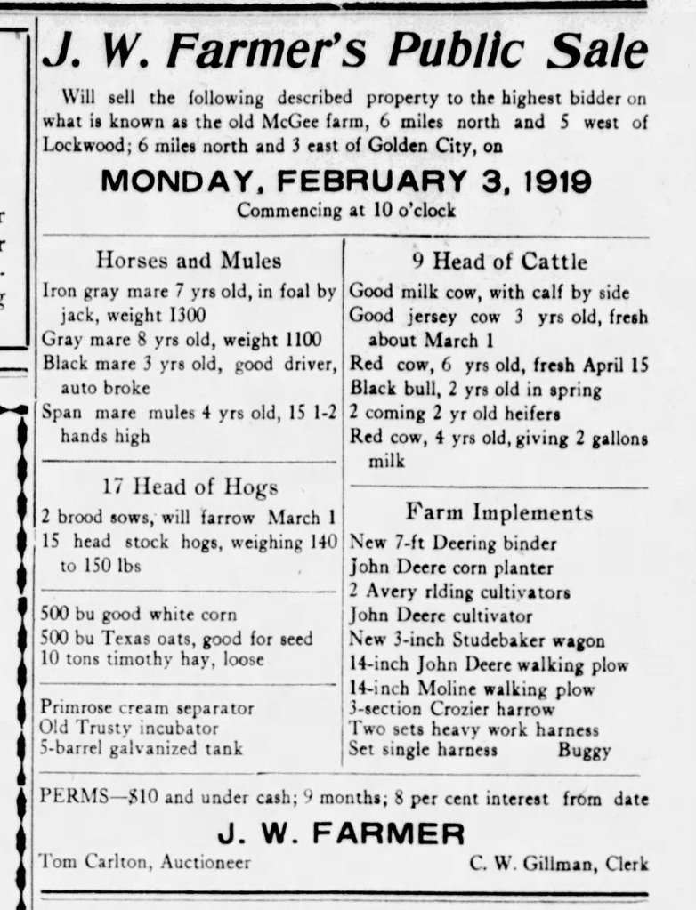 In early 1919, he sold out the farm. The sale bill listed five horses and mules, one in foal; nine head of cattle, 17 head of hogs, 10 tons of loose timothy hay, hundreds of bushels of corn and oats, along with the necessary farm implements. The latter included top brands: a John Deere plow, planter and cultivator; a Studebaker wagon, Moline walking plow and a new Deering binder among them. The land was not included in the sale.