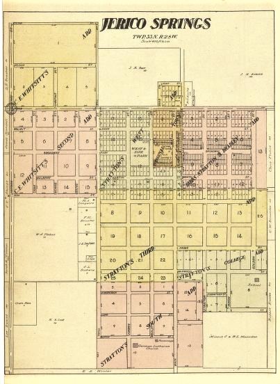 Envisioning a health resort, Mr. Stratton platted the original town of Jerico Springs sometime in 1881-82. Assisted in the work by C. E. Whitsitt, a near-by farmer who would play a major role in the new town, Mr. Stratton also cleaned up the area around the springs and planted trees in the future park.